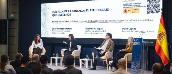 Maria Caprile, directora de investigación de Notus, intervino en una mesa redonda sobre la promoción de un teletrabajo equitativo y de calidad en el marco de un evento organizado por el Ministerio de Trabajo y Economía Social.